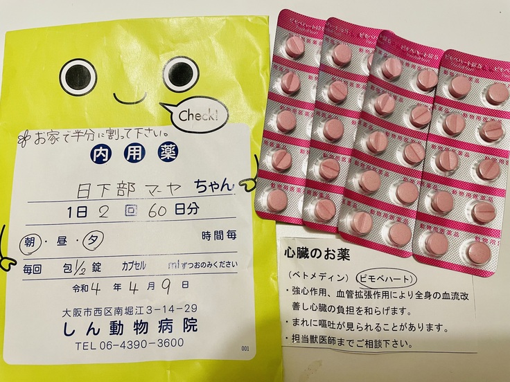 保護当時から心臓に雑音があると診断を受けており、我が家に来て最初の健康診断の時に心臓の病気「僧帽弁閉鎖不全症」ステージB2の診断を受け投薬治療をしてきました。この病気は薬では病気の進行を遅らせるだけで治すことはできません。