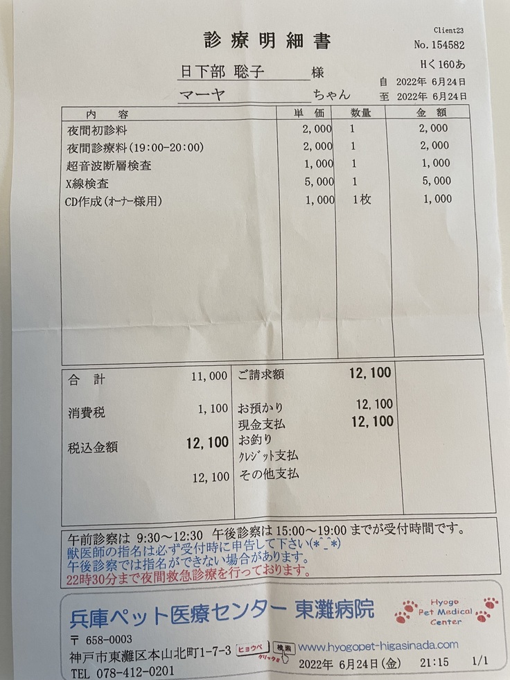 譲渡の時に既にマーヤの推定年齢が9歳だったこと、初診で病気がわかった為、ペット保険加入はできませんでした。