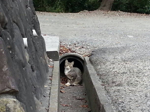 土管のネコ達も、夕方はラッシュを避けた車が山道だからと油断して猛スピードで走っている、危険な場所です。そんな車が走る中を、ネコ達は土管を目指して走って横断します。いまにも轢かれてしまわないか、毎日ヒヤヒヤしながらネコ達の様子を見に行っています。