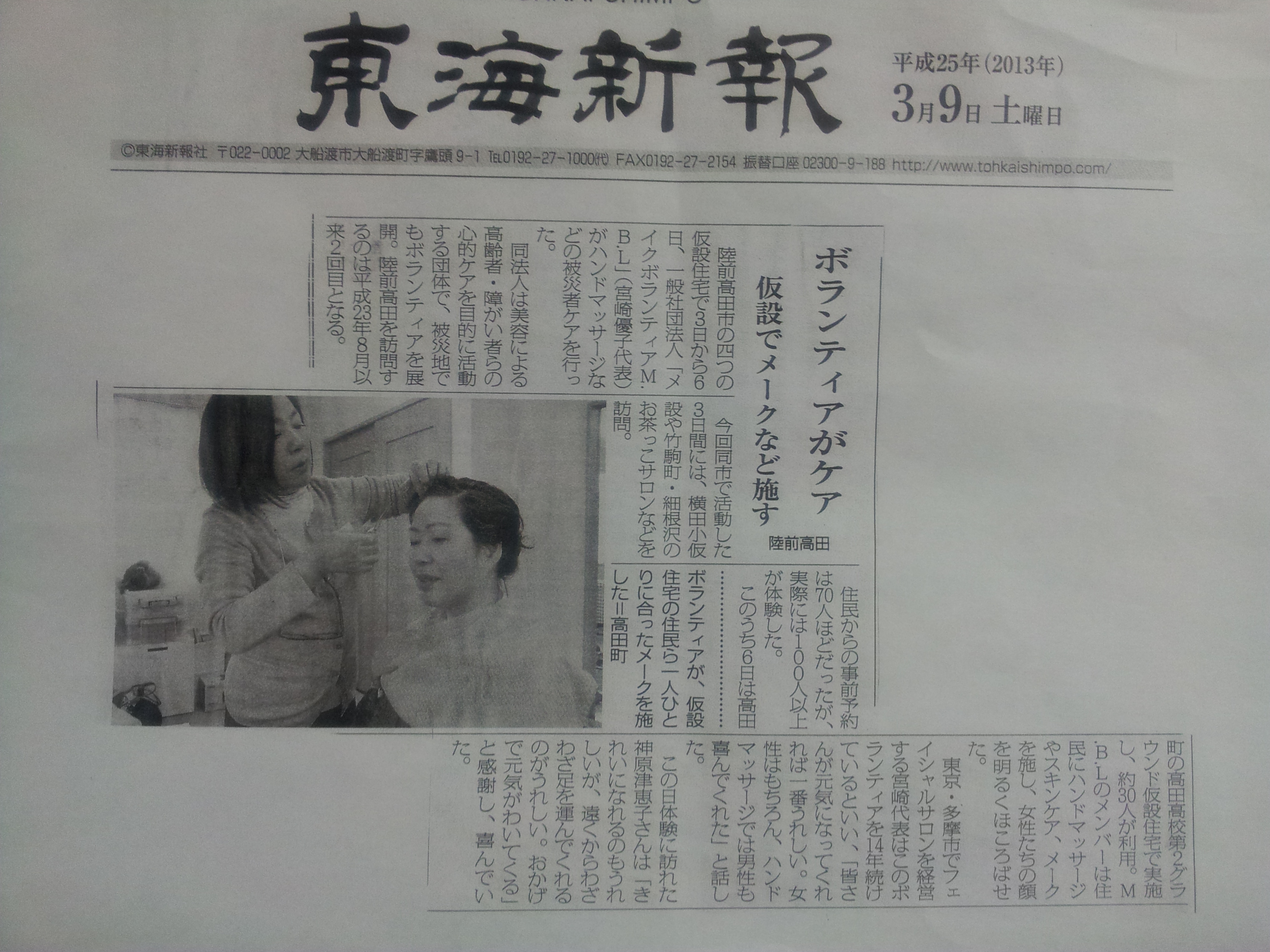 そして今年の3月の陸前高田市。こちらでは陸前高田市の社会福祉協議会の協力を得て3箇所の仮設、1箇所の公民館で二泊三日の間にのべ140名の方とふれ合うことができました。仮設住宅での活動の様子が地元紙の東海新報3月9日付けの新聞に掲載されました。