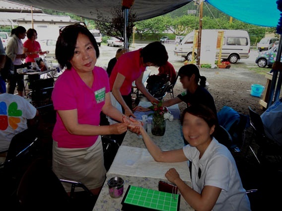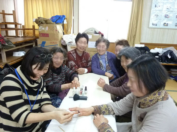そこで、フェイシャル、ハンドマッサージ、メイク、ネイルひと通り希望されることをボランティアに来ている方々も含め老若男女、大勢の方に施術いたしました。2度目は翌年の3月、宮城県七ヶ浜町の公民館へ。3度目は今年3月に岩手県陸前高田市の仮設住宅へ訪問しております。