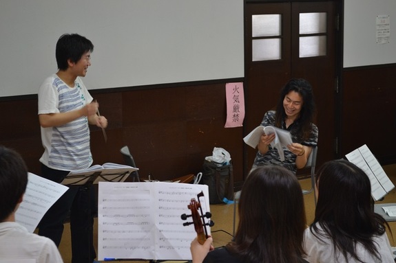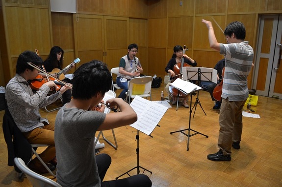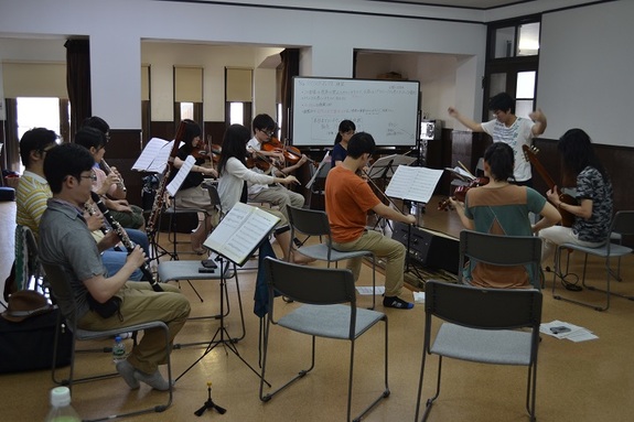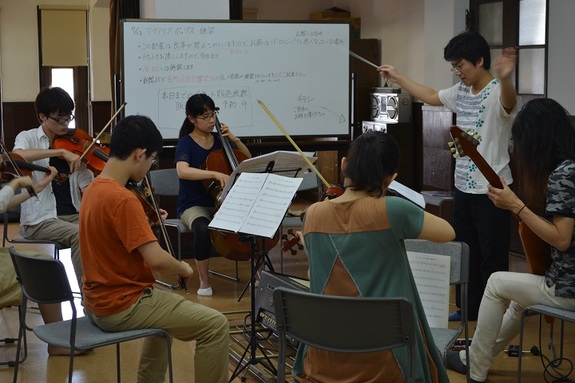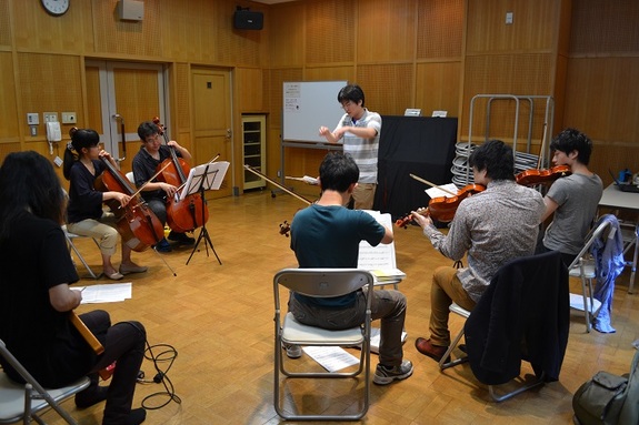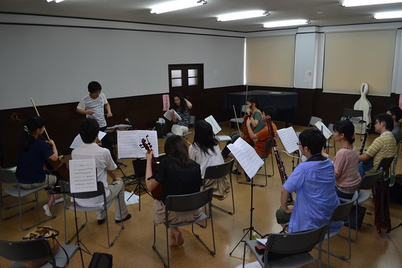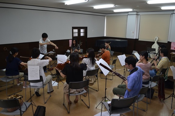 こちらは7月12日の練習。京都市上京区、京都御所のすぐ東にある「鴨沂会館」で行ないました。この日は弦楽器の人数が増え、フルート、クラリネット、ファゴット、トランペットも加わり、オーケストラらしいサウンドになってきました。