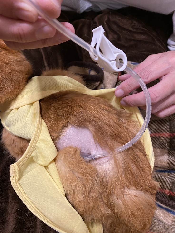 しばらくしたら毎日の点滴も必要なくなるし、腫瘍用フードも漢方薬もサプリメントもチューブから。口からは美味しいものだけ。お医者さんからせっかくチューブ付けたなら胃に入れる抗がん剤もあると。なくなりはしないけど進行を遅らせることは出来ると。