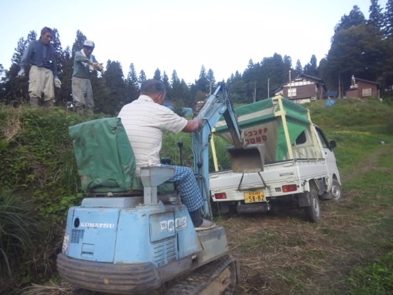側溝に軽トラがはまってしまい、ユンボで引き揚げて頂きました。