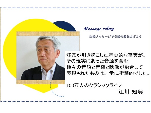 代表・高見が演奏者のコーディネートで協力する「100万人のクラシックライブ」スタッフを務めておられます、江川さんからメッセージを頂きました。