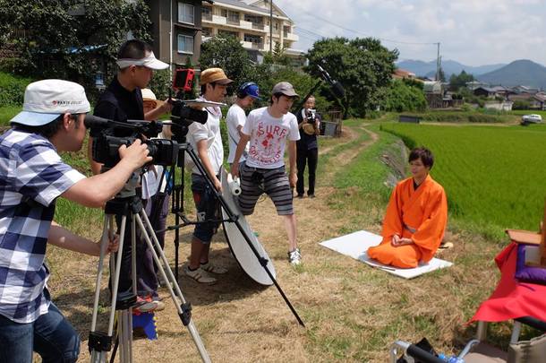 そしてこの写真は、Eスクールのカリキュラムの中で、"ふるさと納税"をPRする動画作品の制作のため、受講生らが現地でロケをおこなっている様子です(落語家さんは学生チャンピオンの四笑亭笑ん太さん)。