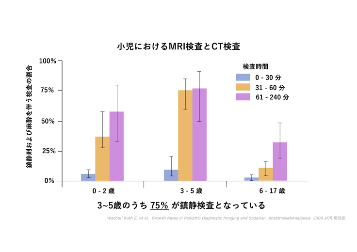 繰り返しの鎮静剤投与は小児の神経発達に対して潜在的な神経毒性リスクの懸念が提起されています。(2) また、鎮静検査に伴う麻酔スタッフの人員確保、や検査時間の延長、患者家族の麻酔関連の不安に対する説明と同意など、医療現場における高額なコストに影響を与えるとされています。(3)