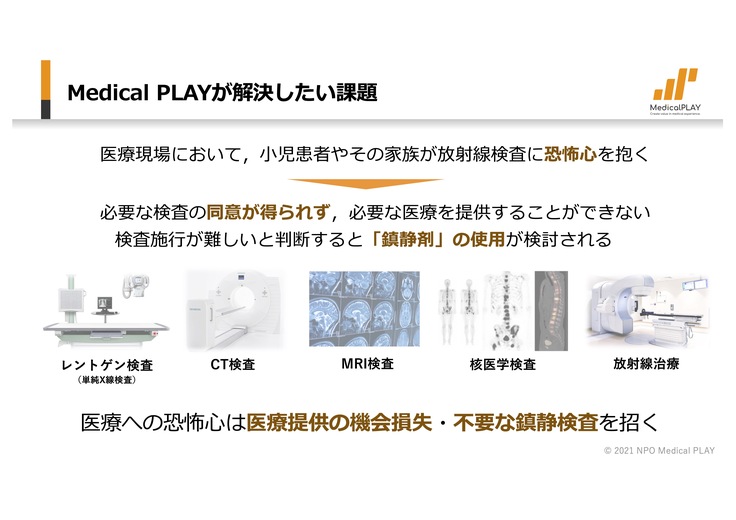 これに対して、私たちNPO法人Medical PLAYは単純X線検査(レントゲン検査)を説明する絵本を医療現場に届け、小児患者とその家族の検査に対する恐怖感情を低減し、子どもたち自身が能動的に検査に臨める環境を提供したいと考えています。