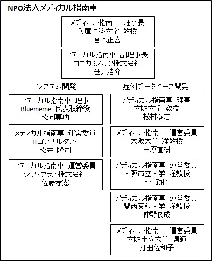 医療画像診断に必要な信頼性の高い知識や豊富な経験を継続的に提供するためには、知識情報処理技術を保有する研究者と医療情報や画像診断の専門知識を保有する医療従事者とが一同に会したプロジェクト体制が必要です。メディカル指南車は、関西を中心に主に大学病院を保有する大学の先生方、医療情報処理の研究者、ITベンチャーの経営者などが集まって設立したNPO法人であり、図に示すようなメンバーで運営しています。