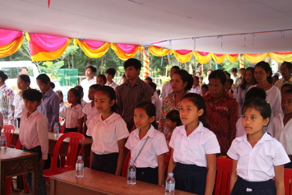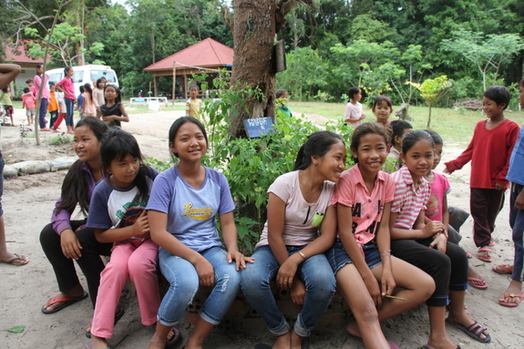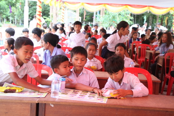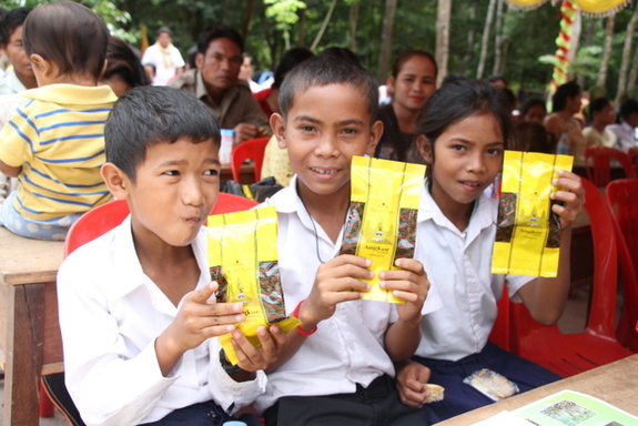 以下、休憩時間の風景です。お菓子とジュースを提供しました。この時間を利用してゲストの方々に、今回のプロジェクトで設置した、水道設備、見本園、栽培園、症状別薬草棚、を案内しました。ワークショップ中は真剣だった子供たちですが、遊んでいるときの顔が一番生き生きしています。アンコールクッキー社からおやつのさしいれを頂きました。ありがとうございます。