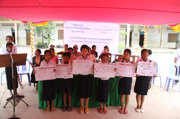 児童たちが感謝の気持ちをこめて描いた「薬草園のある小学校」の絵を披露してくれました。一生懸命描いた絵は、プロジェクトを支援してくれた支援者の代表に感謝の気持ちを添えて手渡されました。