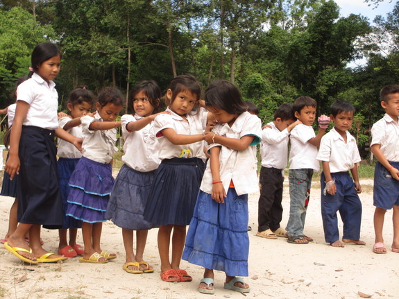 ちょうど全校生徒で校庭の清掃中。元気な笑顔に旅のつかれもふっとぶ。