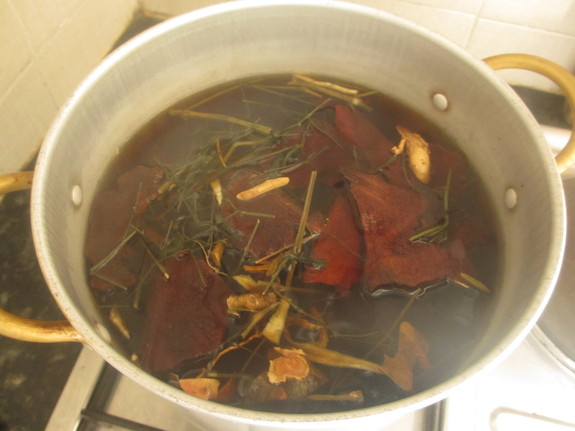 綺麗に洗浄し、鍋にいれた原料に水を注ぎ煮出します。香りは非常に清々しい香り。