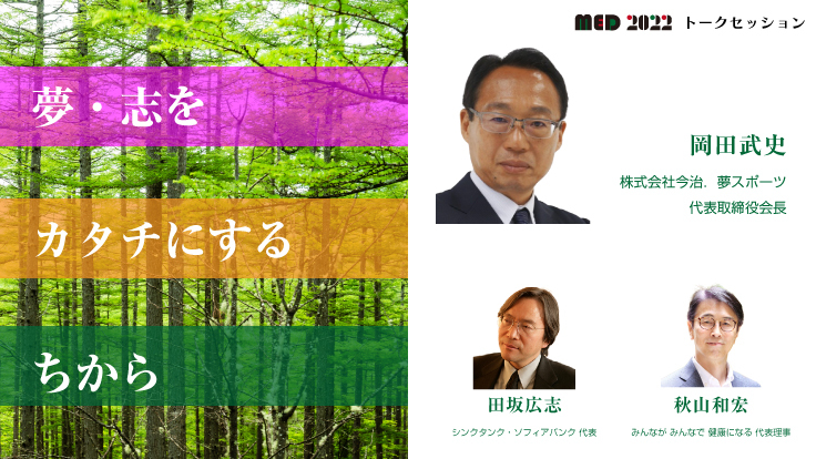 MEDはこれまで一般社団法人みんなが みんなで 健康になる(代表理事 秋山和宏)が主催し、多くのボランティアのみなさんや企業・団体の支援を受けて、開催を続けてきました。2022年からはMEDの運営に強力なパートナーが加わっていただけることになりました。シンクタンク・ソフィアバンク(代表 田坂広志)※です。一期一会に感謝し、MEDは新たなスタートを切ります。