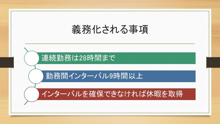 さらに、医師の健康を守るために連続勤務は28時間まで、勤務間インターバル9時間ということが決められました。我々大学病院の勤務医は、当直明けに手術を行ったり、当直明けに外病院に出向しアルバイトをすることを日常的に行っていましたが、それが厳しく制限されます。