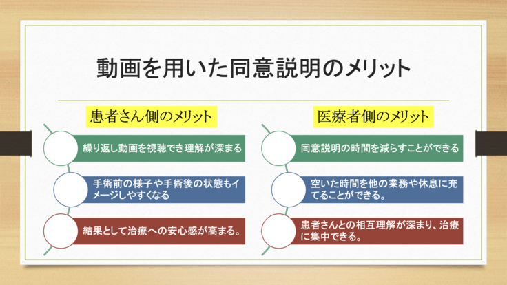 そこで従来の紙ベースを用いた同意取得ではなく、わかりやすい内容の動画を作成して、病状説明に役立てることを考えました。
