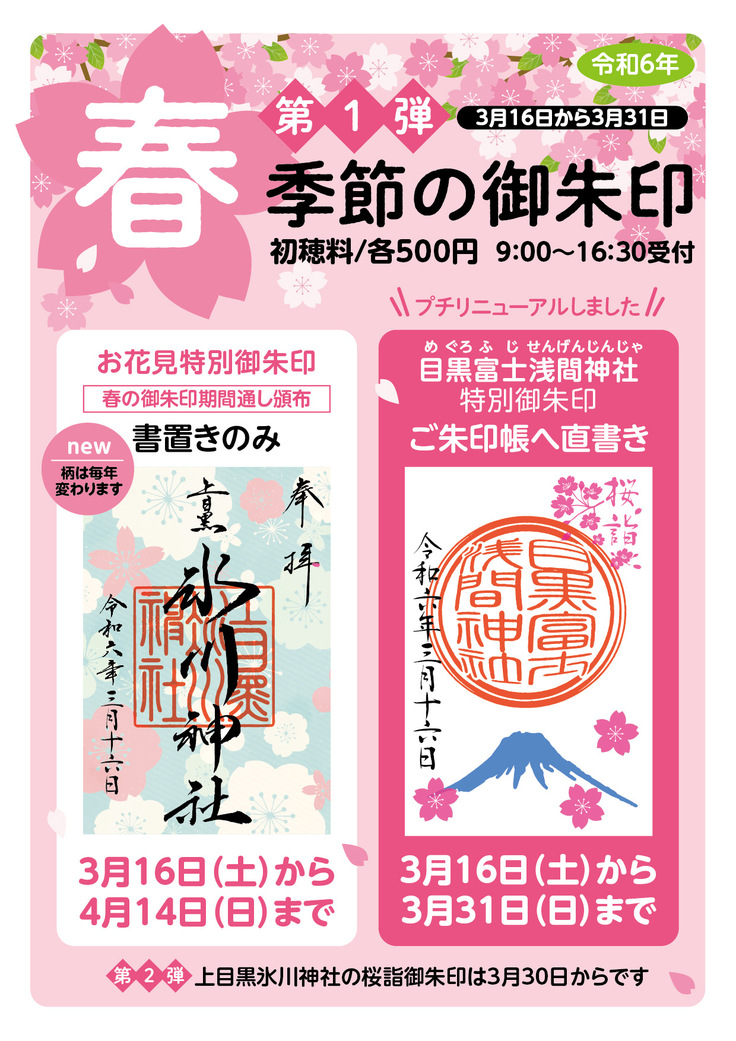 また、3月16日~4月14日までの期間、上目黒氷川神社お花見特別御朱印(書置)も頒布します。