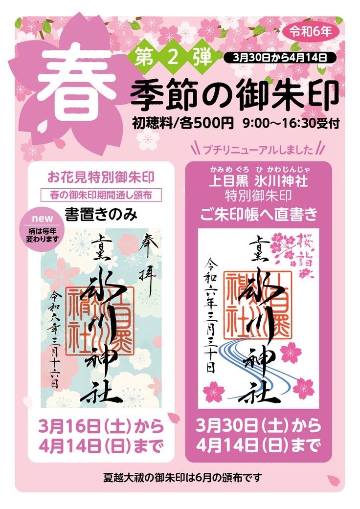 3月30日から4月14日まで、上目黒氷川神社春の特別御朱印を頒布致します♪