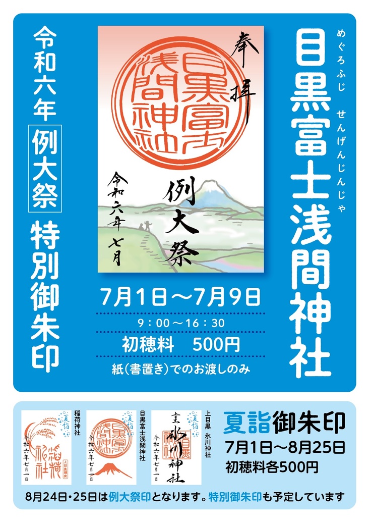 期間中、浅間神社例大祭特別御朱印・夏詣印が入った御朱印・上目黒氷川神社例大祭特別御朱印等を頒布致します。