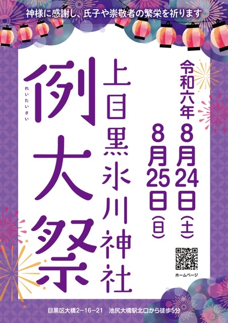 令和6年8月24日(土)・8月25日(日)、上目黒氷川神社例大祭が開催されます。