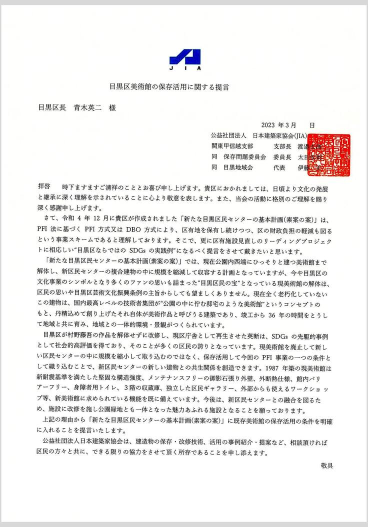目黒区長に出されている専門機関からの現美術館の保存を求める提言書