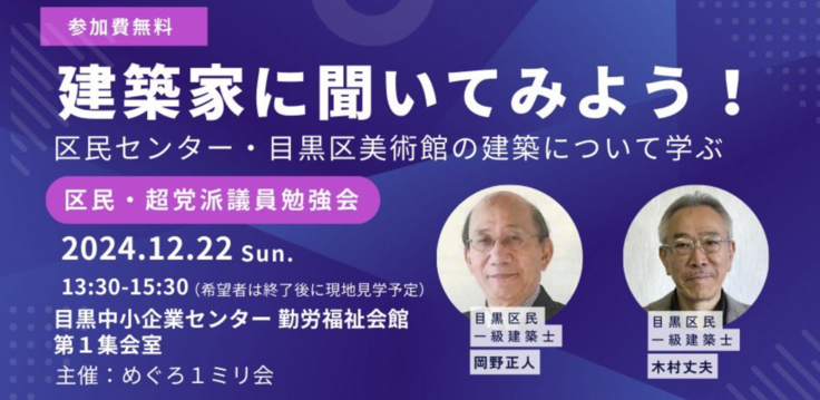背景には建設費の急な高騰が。 今、気になる再開発について建築家のお2人に教えて頂こう!【建築家に聞いてみよう!区民センター・目黒区美術館の建築について学ぶ】 区民・超党派議員会議勉強会 ※要お申し込み ⚫︎講師:目黒区民/一級建築士 岡野正人様・木村丈夫様⚫︎内容:再開発が予定されている区民センター、目黒区美術館を「建築家」の立場から解説