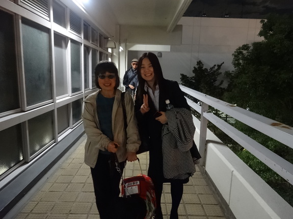 (写真説明:音声ガイド製作最終日、ガイド担当の明大生と三宅さんと廊下でのツーショット。この日は満月が綺麗でした。)