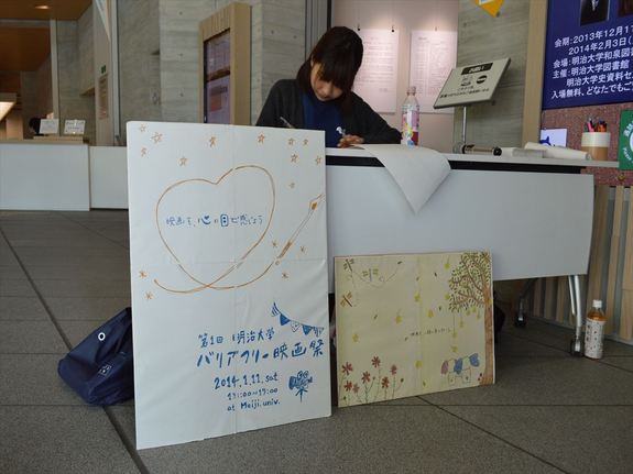 (写真4.受付の準備をしている学生が、イスに座って来訪者リストのチェックをしています。机の前に立てかけられているA2サイズのポスターには学生が書いた「映画を心の目で感じよう」と描かれたバリアフリー映画祭のポスターが飾られてあります。)