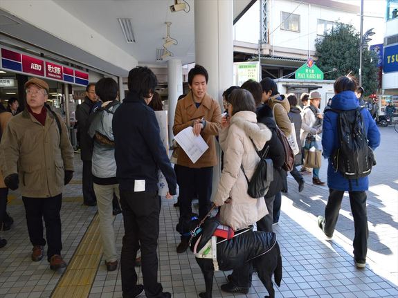 (写真1.明大駅前、スタッフが一人一人きちんと確認して誘導のペアを決めています)