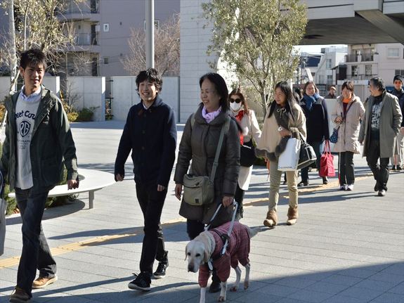 (写真2.道中も楽しい交流の時間。誘導と盲導犬をつれた視覚障がいの方が楽し気に歩いています)