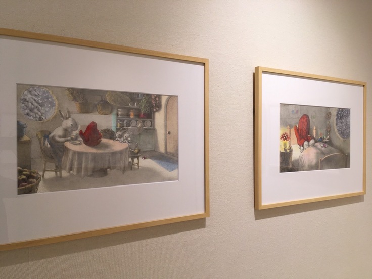 10月下旬に出版予定の絵本「赤いてぶくろ」の原画とオリジナル作品、絵本製作のインタビュー動画が展示されています。