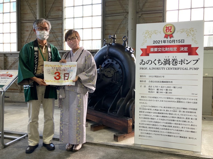 写真:重要文化財への指定が決定した「ゐのくち渦巻ポンプ」の前でボランティアスタッフとボランティア担当