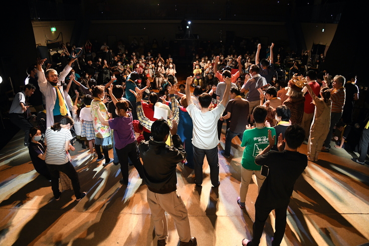 他にも公演が始まる前に、来場された皆さんに舞台や小道具や衣装などを見てもらう舞台見学、出演者の声や服装、足音、ステージの広さなどを伝える舞台説明、手話通訳者も一人の出演者として演じます。公演中に嬉しくて声を上げたり、客席を歩き回り、舞台に飛び上がる方がいらっしゃいますが、舞台に上がった方はそのまま演者として自由に演技することもOKです。