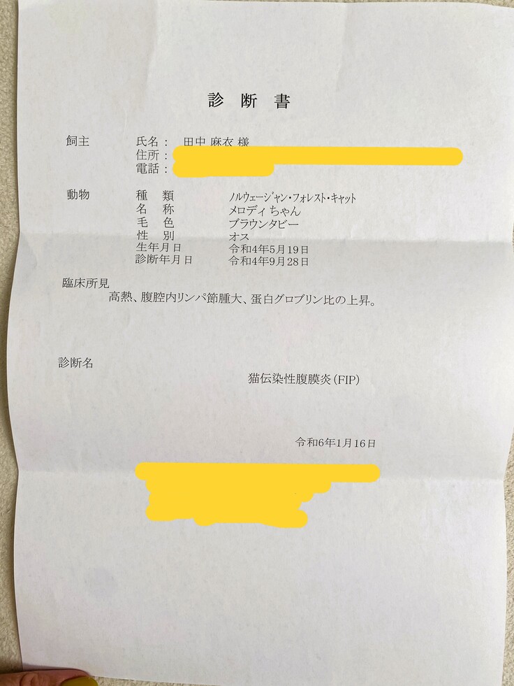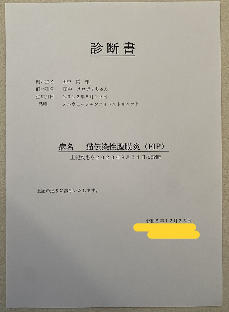 その後早急に血液検査などを行い『FIPでほぼ間違いないでしょう』と言われ
