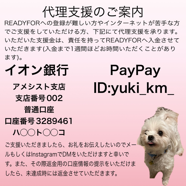 また、お礼をお伝えしたいので、代理支援をしていただいたら、ぜひメールアドレス(secondmoon.kisaragi@gmail.com)かInstagramでDMをいただければ幸いです。