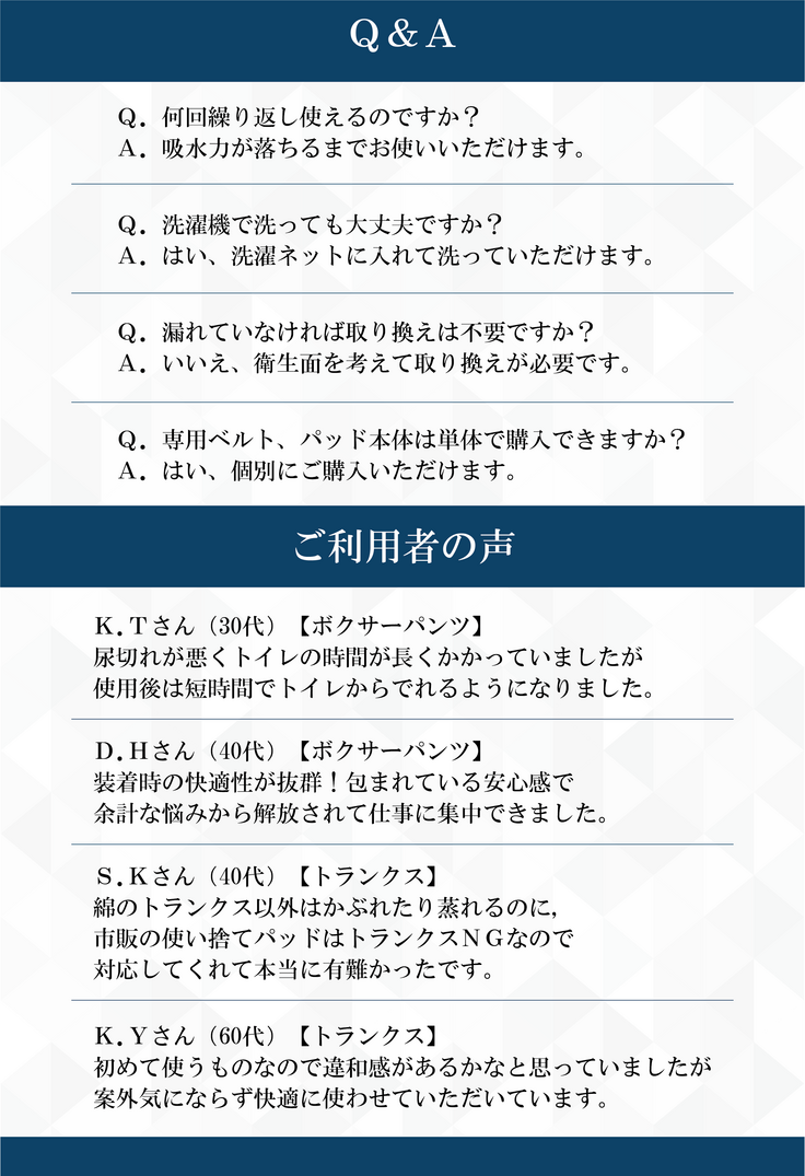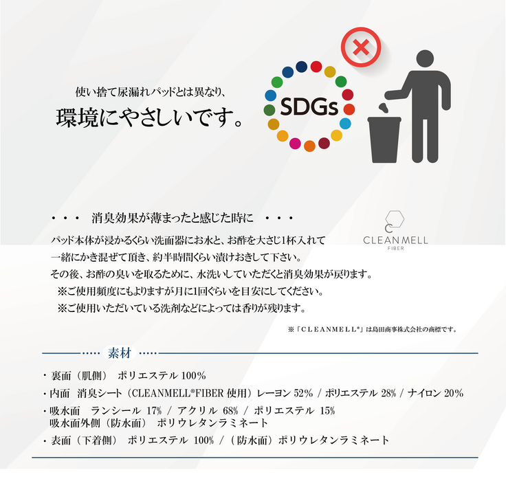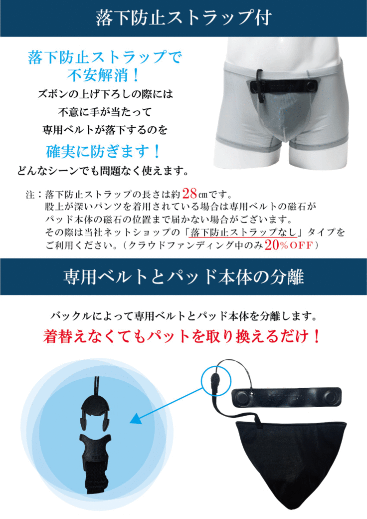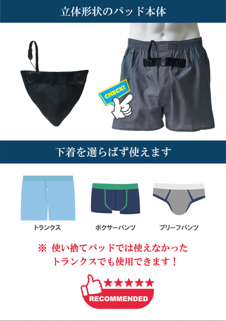 現在、市場に存在する尿漏れ関連商品の多くは、『いかにも尿漏れ用』というデザインであったり、使い捨てパッドは男性のプライドを大きく傷つけたりするものです。
