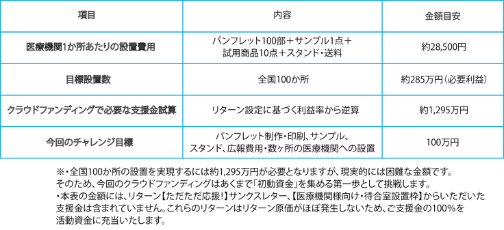 - 私たちの目標は全国100か所の医療機関への設置です。しかし、その実現には、1ヶ所の医療機関へお届けするパンフレットや、品質を直接お確かめいただくための製品サンプル10点を含め、1ヶ所につき約28,500円の経費がかかります。 この目標を達成するためには、費用を賄うためには約285万円の利益を生み出す必要があります。しかしながら、利益目標をクラウドファンディングの支援金だけで達成しようとすると、約1,295万円もの大規模な支援金が必要となり、これは簡単なことではありません。そのため、今回のチャレンジは、あくまで「スタートライン」に立つためのものです。ご支援いただいた資金は、最初のステップとして少数の医療機関様に設置させていただくための、パンフレットやサンプルスタンド、その他広報活動費に充てさせていただきます。同時に直販に力を入れ、SNSなどを活用して直接お客様に届けることで、利益率の向上を目指し販売数を増やすことに注力いたします。そうすることで、安定した販売数を得ることが可能となり1ヶ所でも多くの医療機関様へ設置させていただくことが出来ると考えています。