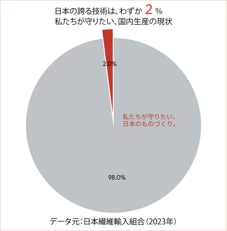 現在、国内で生産される衣料品はわずか約2%にまで減少しています。