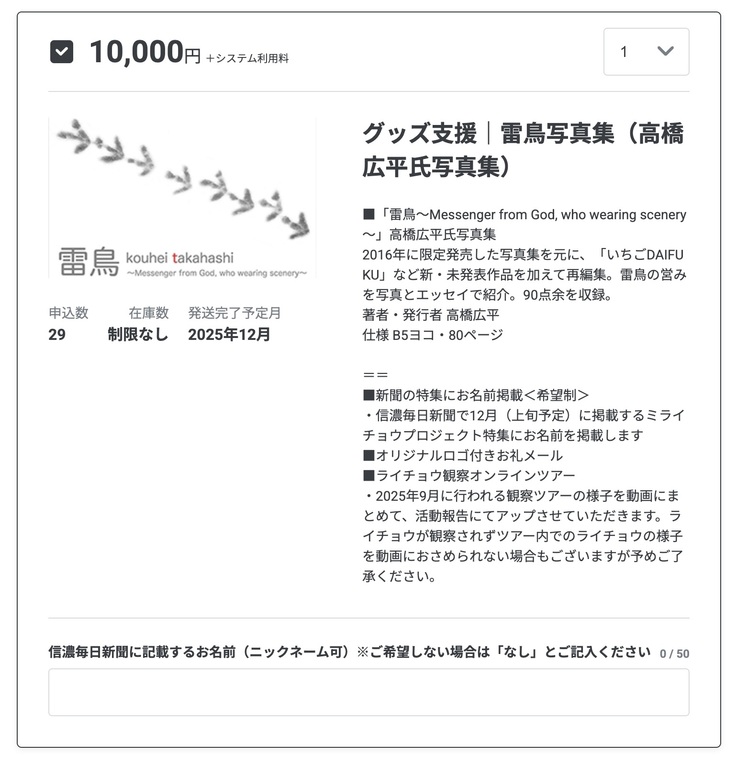高橋さんによる「雷鳥写真集」はクラウドファンディングの返礼品としてもご用意いただいています。