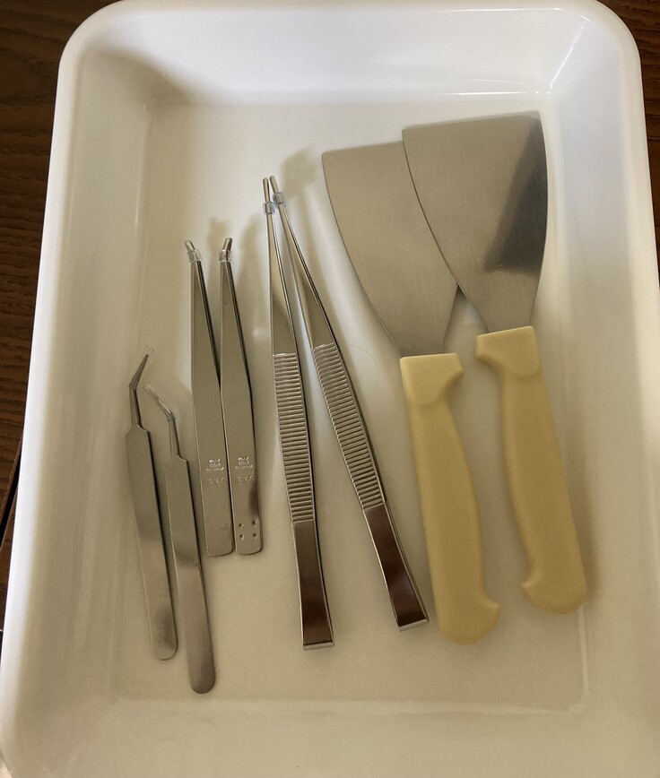本当に小さい石や乾いて小さく縮んだ海藻やごみなどが混ざっているのでピンセットなどで丁寧に取り除いていきます。