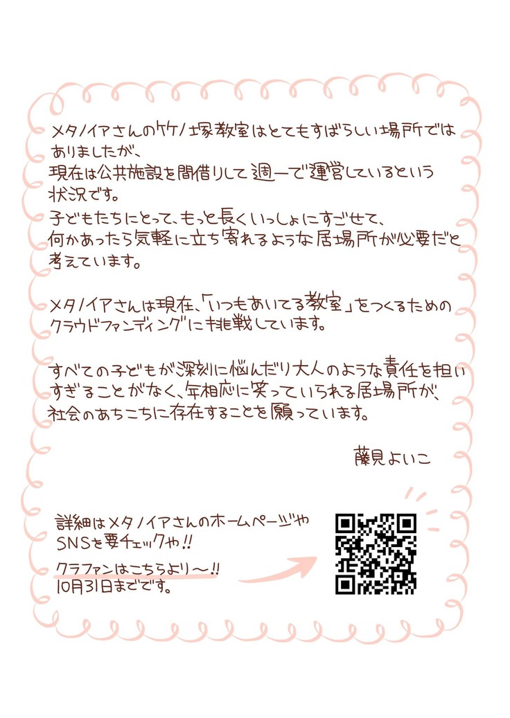 昨日の活動報告で、漫画家の藤見よいこさんが書いてくださった竹ノ塚拠点の漫画をご紹介しました。
