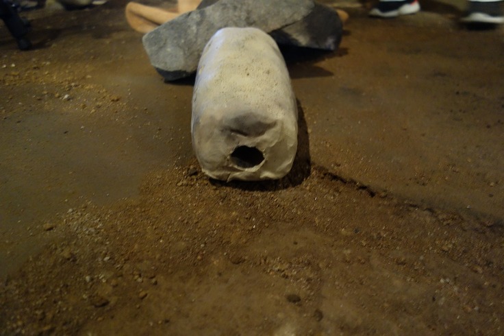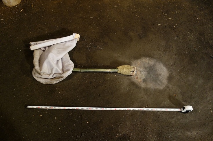 私がNHKに託されたタスクは、弥生時代から古墳時代にかけての鍛冶技術の発展を披露する、というものでした。そのため弥生時代の鍛冶工房を復元し、鍛冶実験をいくども体験している淡路市の国史跡五斗長垣内遺跡に赴きました。そしてその工房のなかに、弥生時代の九州外部に広く波及したⅣ類鍛冶炉と古墳時代のはじまりとともに現れる大型羽口(博多型羽口)を使用した(弥生時代でいうところの)Ⅱ類鍛冶炉を復元し、炉内温度や鉄の熔融状況の違いを示すことに努めました。Ⅳ類鍛冶炉とは、炉穴を掘り込まず、床面にそのまま木炭を敷いて、着火後、送風する炉です。鞴から延びる管の先端には、操業直前に粘土を巻いて、送風管の先端が焼けないようにしました。なぜそうしたかというと、五斗長垣内遺跡では当時の鍛冶工房で管のものと思われる圧痕をのこした粘土塊が発見されているからです。先端を保護しないと管は焼けてしまうので、このような工夫が一般的にあったと思われます。続く古墳時代に入ると、あらかじめ焼成された土製の羽口を送風管の先に取り付けるようになります。が、その羽口の大きいこと。遺跡では割りとられた先端部しか出てきませんが、元々は短くても、番組に出てきたほどの長さは本来あったはずです。この博多型羽口の起源は韓国の東海岸にありますが、未使用品は40~50cmはあります。ちなみに、羽口はよく「粘土を芯棒に巻き付けて作った」と言われますが、実は違います。よくこねた粘土の塊の中心に、棒を突き刺し、その後粘土塊を横にしてゴロゴロと転がし、長くするのです。そして芯棒を引き抜く。今から約30年前、故白鷹幸伯師匠と鍛冶実験を開始した頃、初めてそれを体得し、そのごの羽口を用いた鍛冶実験も全てそのやり方でした。遺物の羽口にも粘土の継ぎ目や擬口縁のような痕跡にほとんど出くわさないのでそうだと考えています。