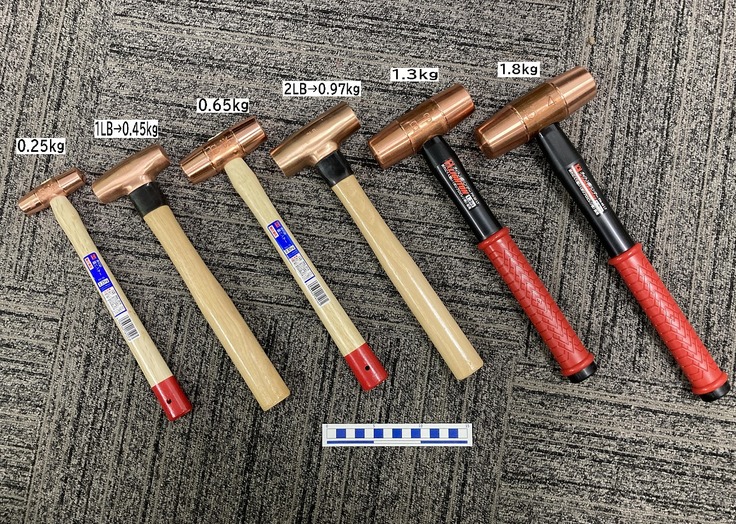 プロジェクトメンバーの一人、広島の三上高慶刀匠には6本の銅の鎚を工房でご覧に入れました(写真1)。このプロジェクトで復元に取り組んでいる隕鉄製鉄器は、その多くが青銅器時代のものであり、そのため鎚は銅製を想定しなければならないからです。三上さんは「これ良さそうだね」と普段使っている鉄槌と同じくらいの重さである1.8kgと1.3kgの銅鎚2本を手にされました。早速、炉に火を入れ、隕鉄を熱し、その銅鎚で鍛えると隕鉄が変形し、きれいに伸びるのです。三上さん曰く「使いやすいね」(写真2)。驚きました。ただ鉄鎚の場合だと鍛えたあとの反動が強く、鎚が自然に振り上がるが、銅鎚の場合は反動がなく、腕の力で振り上げなければならないそうです。刀匠の力、技と道具の連動をその場で言葉にしていただき、感激しながらメモをとりました。もっとも三上さんは作刀の際、微調整の部分で銅鎚を使った経験をお持ちということでした。これ以外にもいろいろなお話をおうかがいしましたが、秘技かもしれないので許可をとってからいずれご披露することとしましょう。