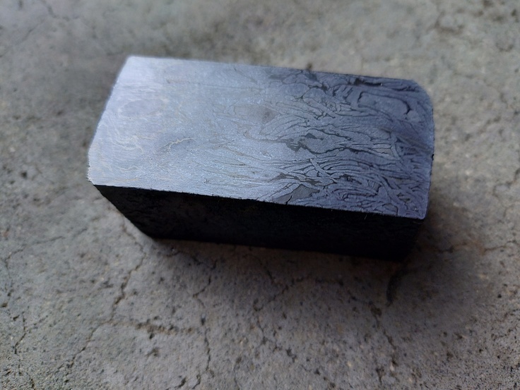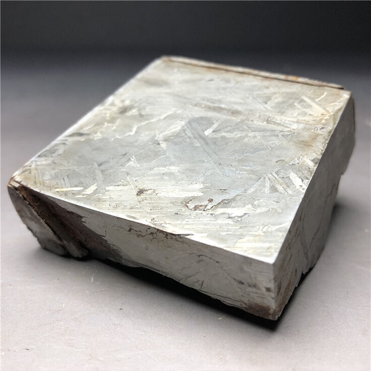 さて隕鉄加工の様子について一例を紹介します。三上さんにカットした状態で入手した700gの新疆アルタイ隕鉄(写真3)を鍛えていただきました。幾何学的なウィドマンシュテッテン組織が美しい隕鉄です。これを銅鎚で鍛打し、今後の加工が容易になるように立方体に整形されました。その重さは500g。つまり200gが固まらずにそぎ落とされ、不純物として排除されたのです。この作業によってあのウィドマンシュテッテン組織はどうなったのでしょうか。そのままの形で残っているのか、それともなくなってしまったのか。その様子を観察するために砥石で研磨し、エッチングしてみてみました。すると鏡のようにきれいな面に曲線的な模様が浮き出ているではありませんか(写真4)。直線が組み合わさった幾何学模様は刀匠が振るう銅鎚からの力が加わって変形し、波のような模様に生まれ変わったのです。その模様はダマスカス鋼のそれを彷彿とさせます。ダマスカス鋼は鍛造後のウィドマンシュテッテン組織を再現したものなのか、と考えてみたくもなります。