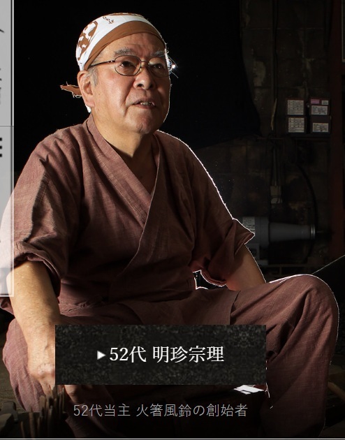 明珍家については本プロジェクトの冒頭でも紹介しましたが、平安時代より続く甲冑師の家系であり、12世紀半ばに近衛天皇に明珍の姓を賜り、その後は姫路藩のお抱え甲冑師の命を受けたこともあります。明珍家ホームページ(https://myochinhonpo.jp/)によると、その後の明珍家は明治時代の廃藩置県により甲冑の需要がなくなり、千利休のために火箸を作ったという故事にならい火箸製作で起死回生を図りました。戦時中は鉄の入手が困難になり、戦後の高度経済成長期には火箸の需要が低減するなど何度も危機に見舞われます。しかし、伝統の技を途絶えさせないため、52代明珍宗理が試行錯誤を重ね、昭和40年ついに「明珍火箸風鈴」が誕生しました。私も明珍家の火箸風鈴をかつては7組もっていましたが、海外から訪れる友人たちに欲しいとせがまれプレゼントしてしまい、今では職場に吊り下げている1組しか手元にありません。