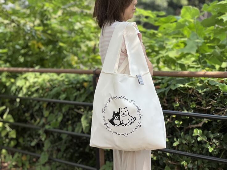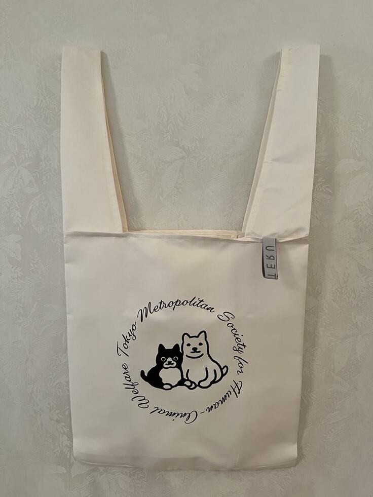 犬と猫が手を重ねてきずなを表現しているロゴマークが、エコバッグにドーンとデザインされています。