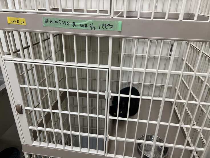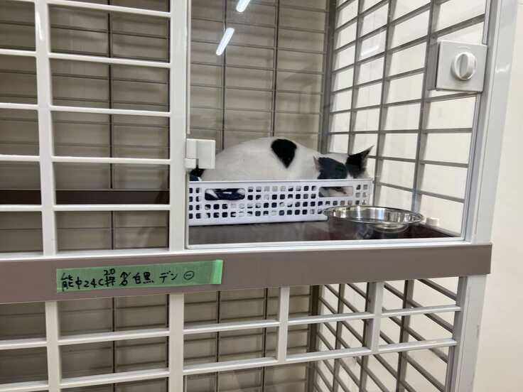 10月10日に能登から9頭を私たちが連れて帰ってきましたが、その中の「でん」ちゃん、黒子猫の「パピコ」ちゃんは、明大前動物愛護病院で検査や治療をうけて現在滞在中です。