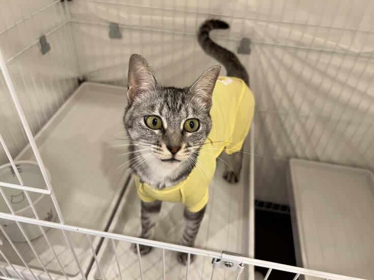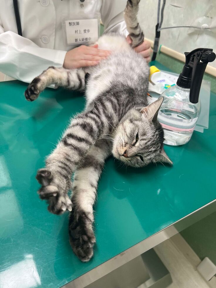 東京に到着して、動物病院に搬入。アレルギー症状とみられる、首、左腕、内腿の傷があり、なめてしまうため、しばらくエリザベスカラーやお洋服を付けることになりました。出産後、感染もあり発熱、子猫たちに哺乳することもできなかったからでしょう、乳腺のあたりと鼠経リンパ節に腫れがみられました。耳の汚れがひどく、悪化しないよう経過観察することとなったのでした。