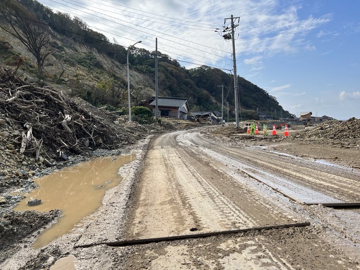 地震で大きな被害を受け、豪雨で壊滅的な被害を受けて、あちこちでブルドーザーなどの工事重機が目に付くのに、最近、動かしているように見えません。