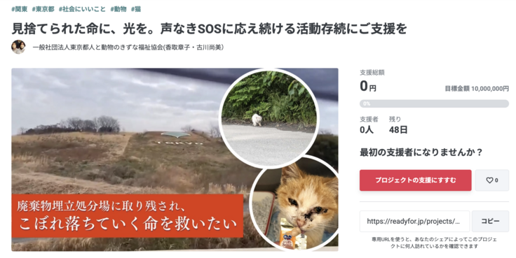 そこでこの度、私たちは再びクラウドファンディングに挑戦し、東京都中央防波堤廃棄物埋立処分場から保護した猫たち、そして被災地から来た病気の猫たちを含む“今この瞬間に生きる命”を支え、そして終生の家族の元へとつなげるためのご支援を募ることを決断いたしました。
